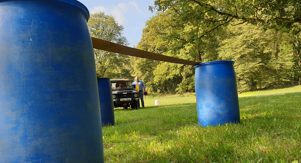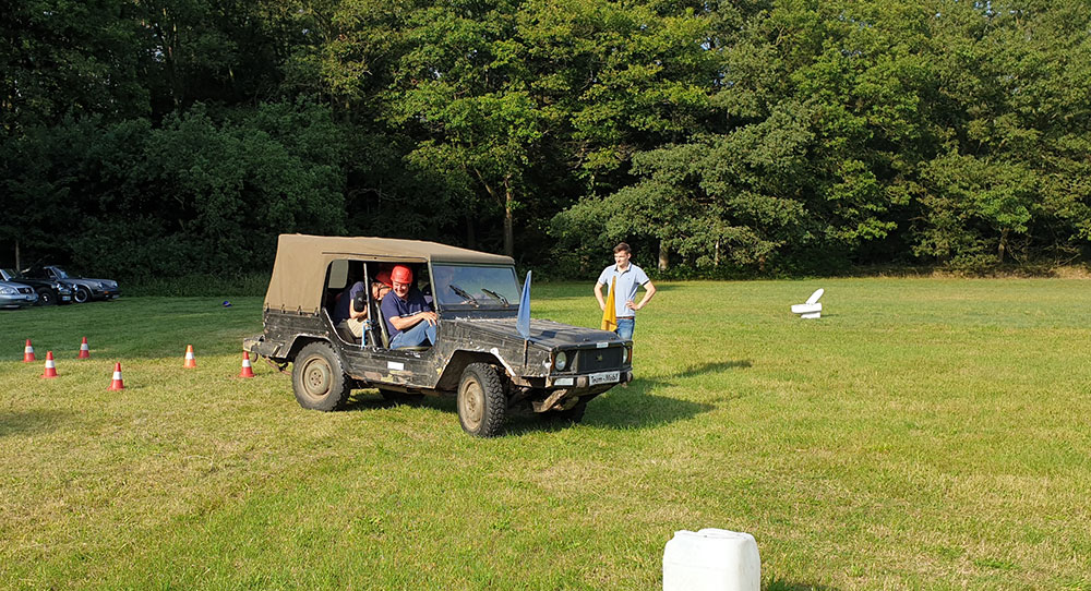 „Nanu?? Hier stimmt doch etwas nicht! Kein Gaspedal auf der Fahrerseite, die Bremse fehlt auch, der Schalthebel ist nach hinten gerutscht??? Hier stehe ich allein wohl auf verlorenem Posten…“ Die Aufgaben: Schalten, Lenken, Bremsen, Gas geben etc. müssen auf einige Köpfe verteilt werden. Hier geht es wirklich um enge Abstimmung und Zusammenarbeit, um das Fahrzeug mit Ihrem Team über den vorgegebenen Parcours zu bewegen, ohne das die Hindernisse berührt werden
